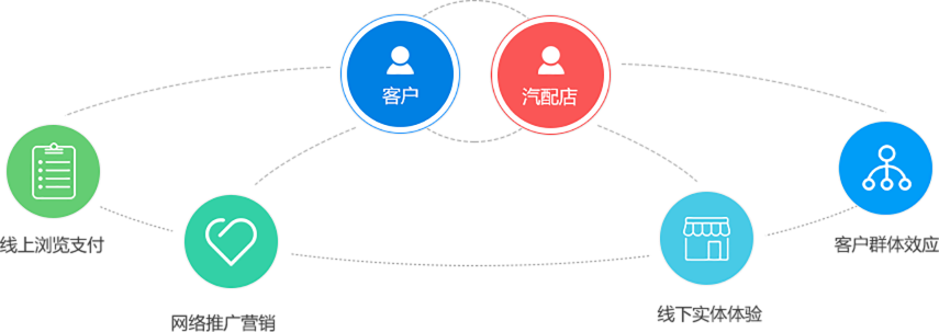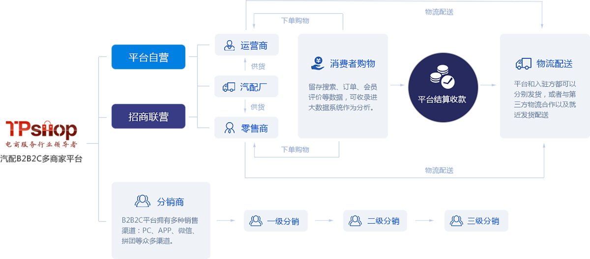 TPshop針對當下汽配電商行業的痛點和傳統4S店銷售模式的優勢,以“B2B2C+O2O”的理念建立了由“PC+APP+WAP+微信端”組合的汽車電商全渠道生態體系。